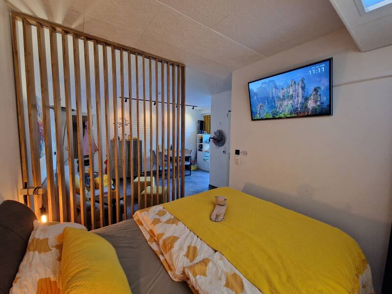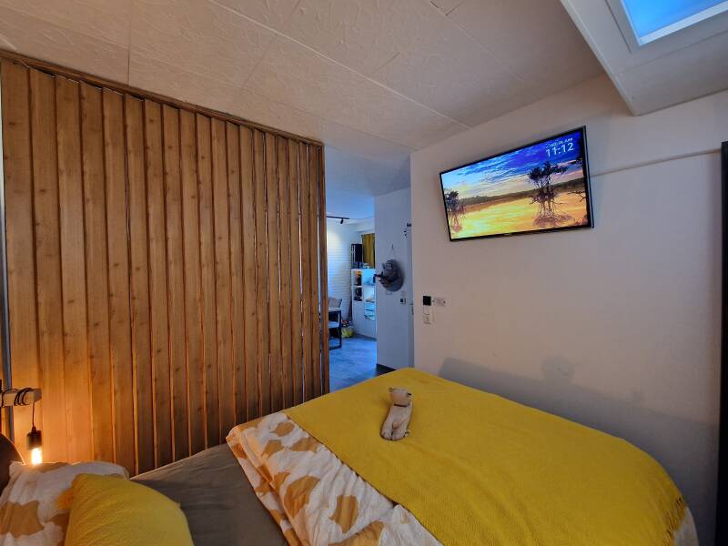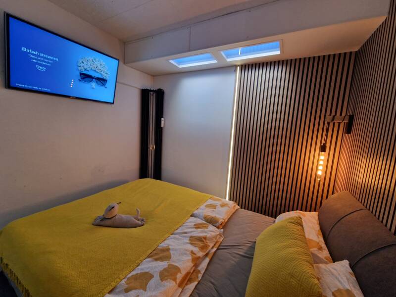 Im Schlafbereich haben wir ein neues und komfortables Boxspringbett (140x200 cm) hingestellt sowie ein FlatTV.
